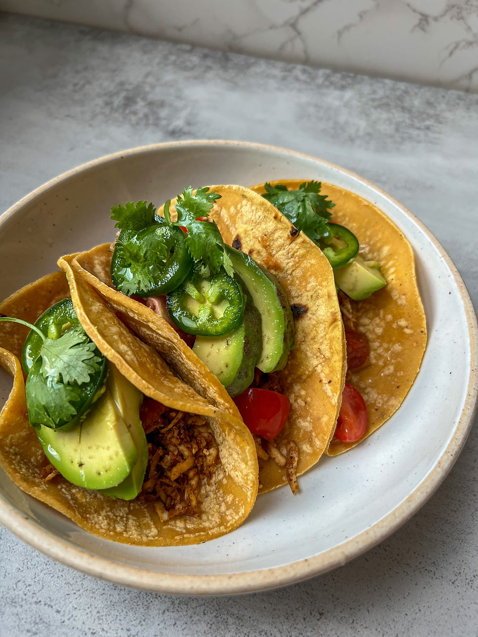 4. Assemble your tacos with the prepared shredded “chicken” tofu and your favorite toppings. Squeeze lime juice over the tacos and enjoy!